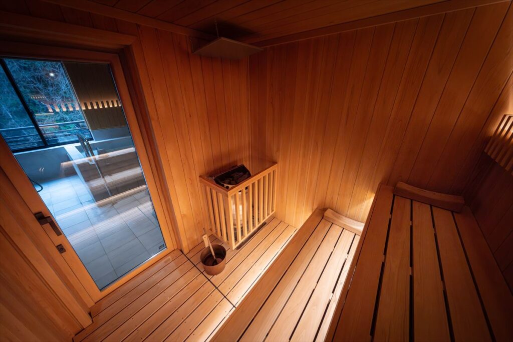 お泊りいただくお部屋に、本格的なサウナ室・水風呂・外気浴スペースが付いています。
